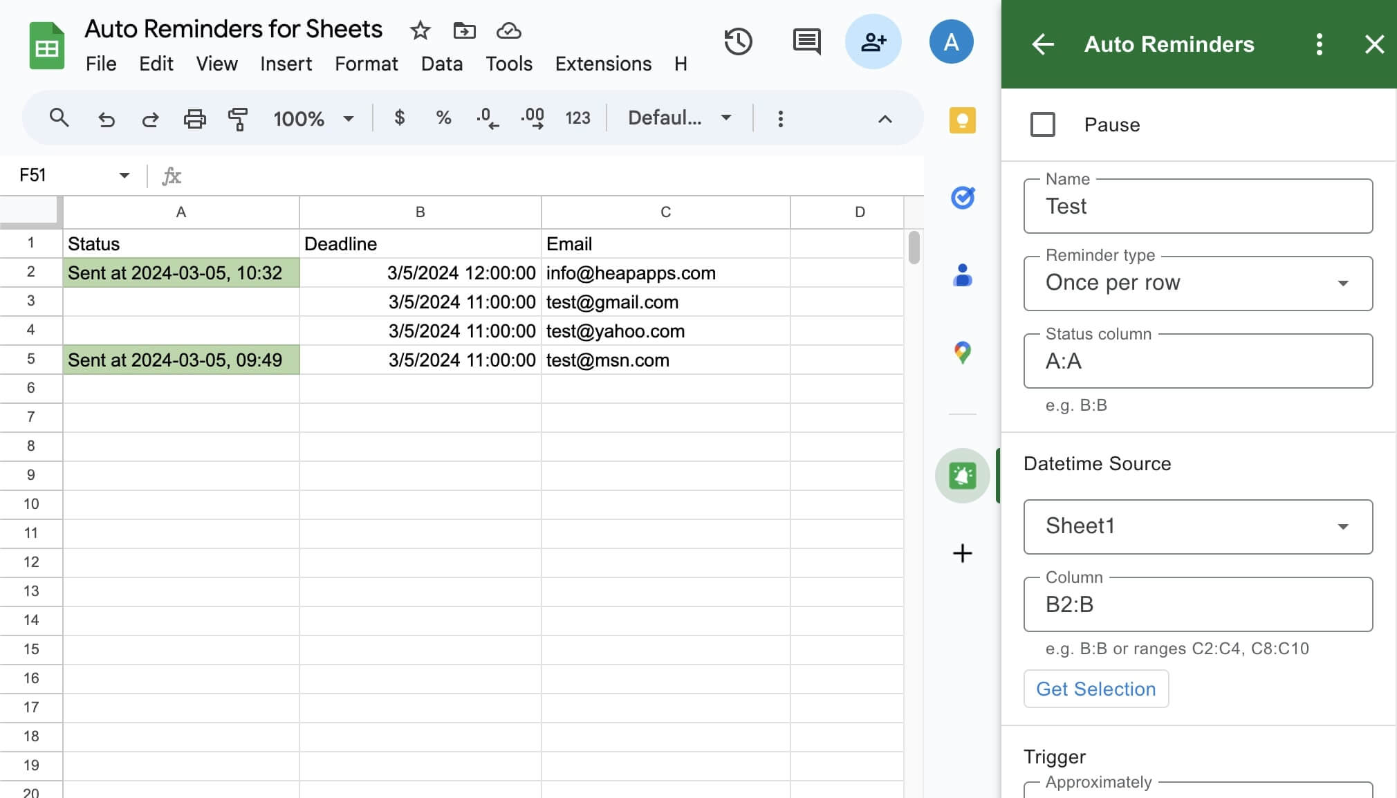 Schedule reminders effortlessly based on your sheet data by defining deadlines and recipients.